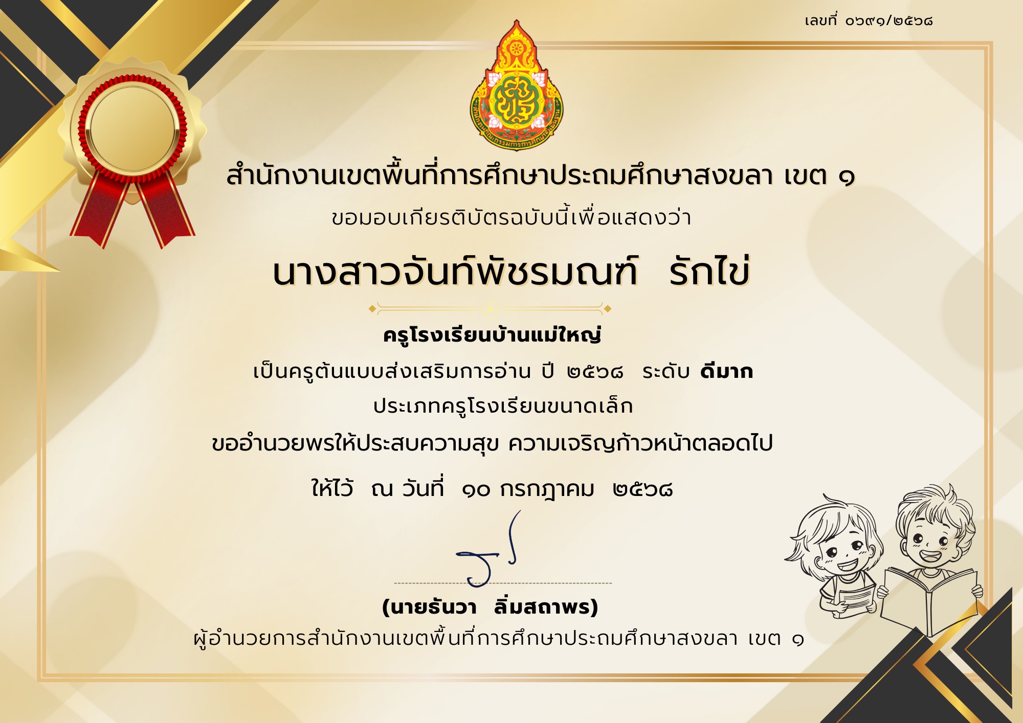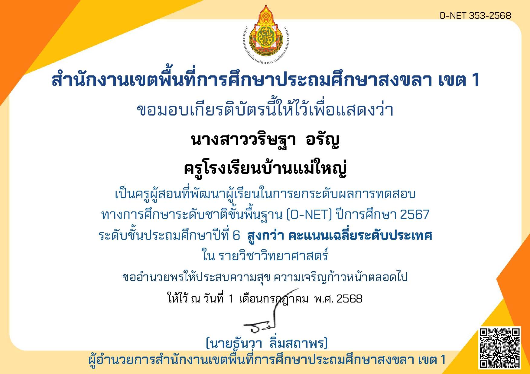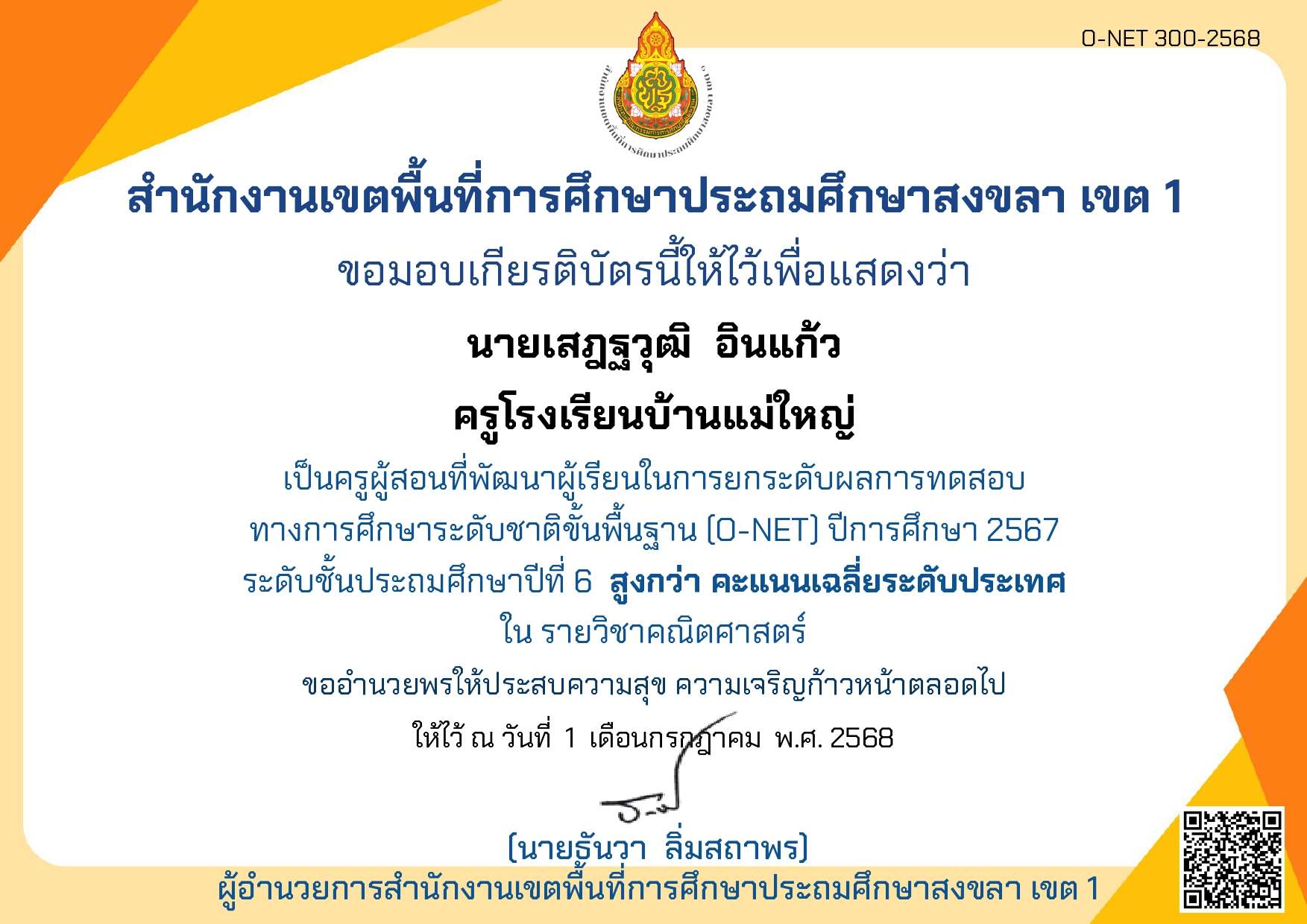 เป็นครูผู้สอนที่พัฒนาผู้เรียนในการยกระดับผลการทดสอบทางการศึกษาระดับชาติขั้นพื้นฐาน (O-net)ปีการศึกษา 2567 ระดับชั้นประถมศึกษาปีที่ 6 สูงกว่าคะแนนเฉลี่ยระดับประเทศใน คะแนนเฉลี่ยรวมทั้ง 4 กลุ่มสาระ |