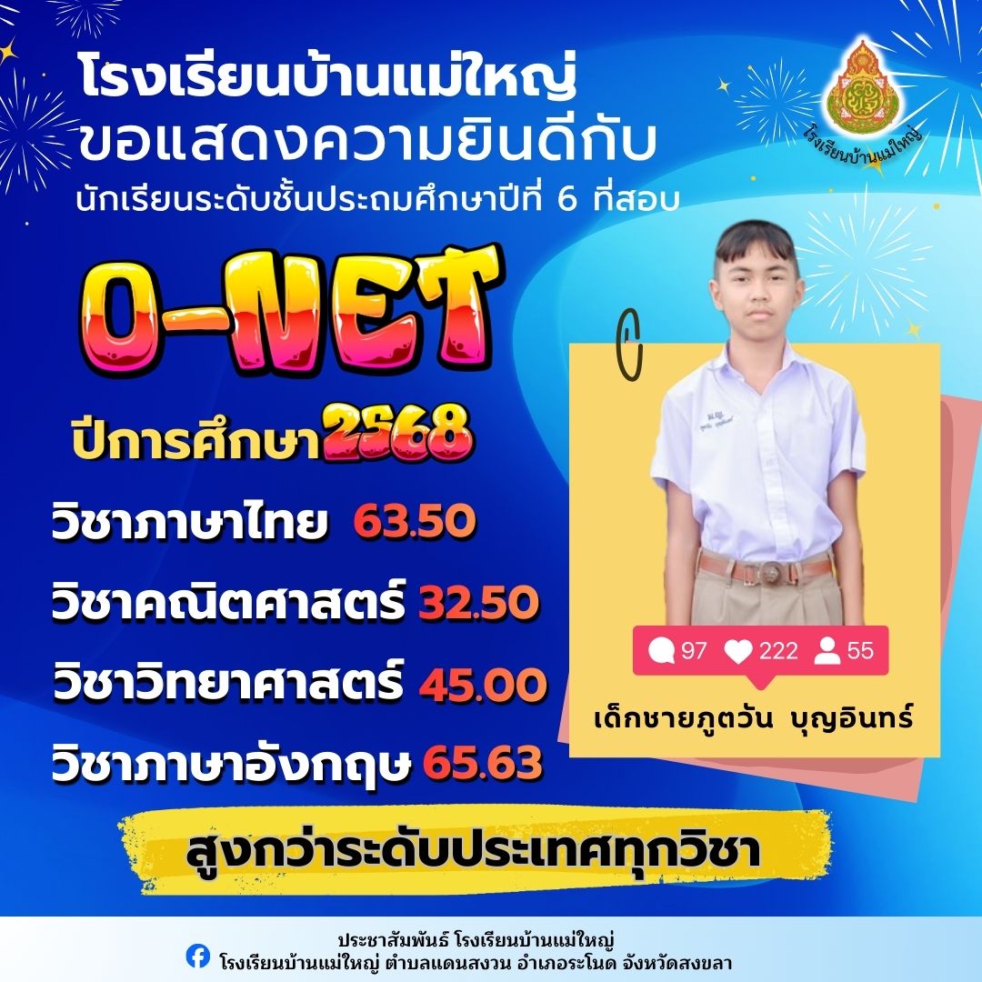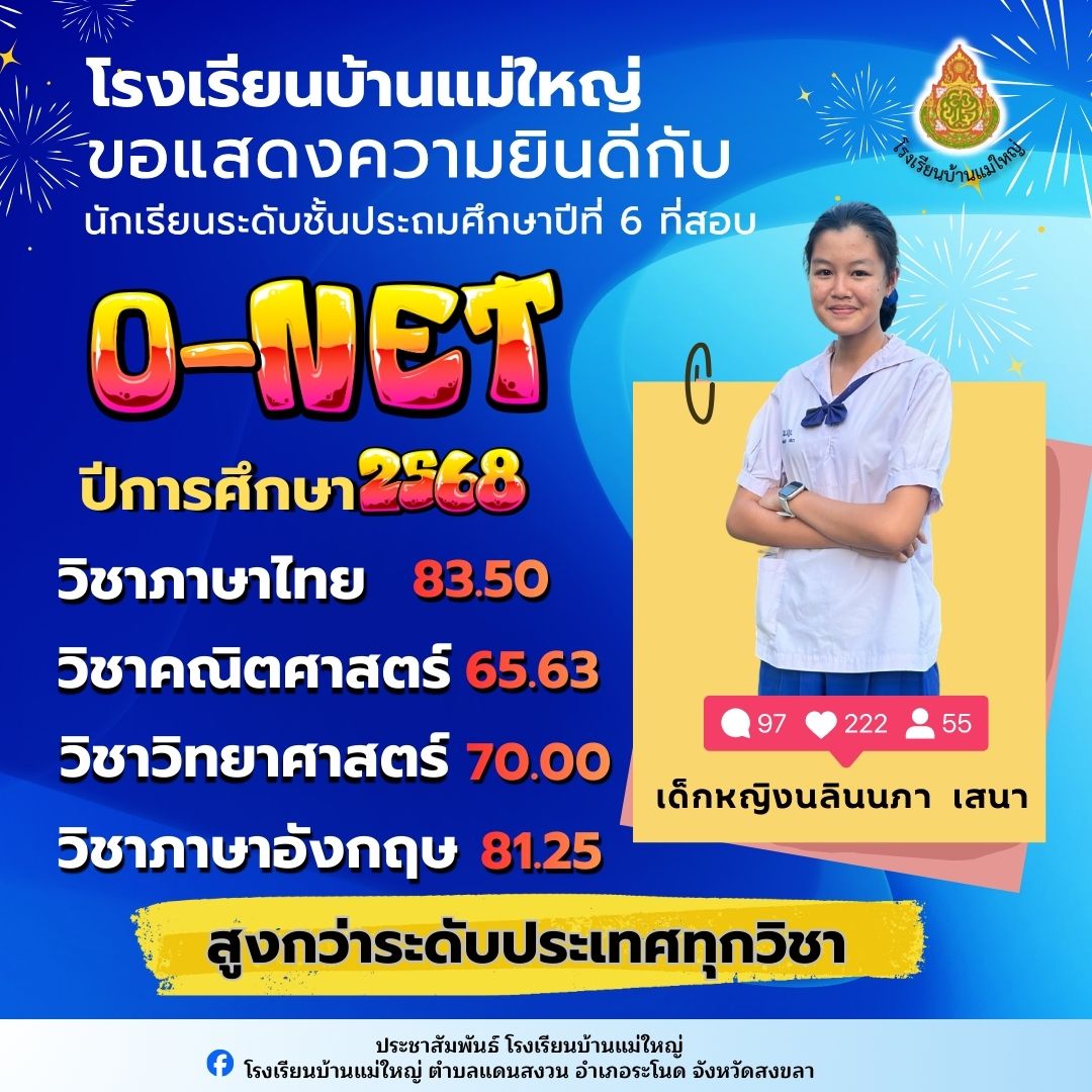 เว็บไซต์...โรงเรียนบ้านแม่ใหญ่ ม.5 ต.แดนสงวน อ.ระโนด จ.สงขลา 90140....ยินดีต้อนรับ....
